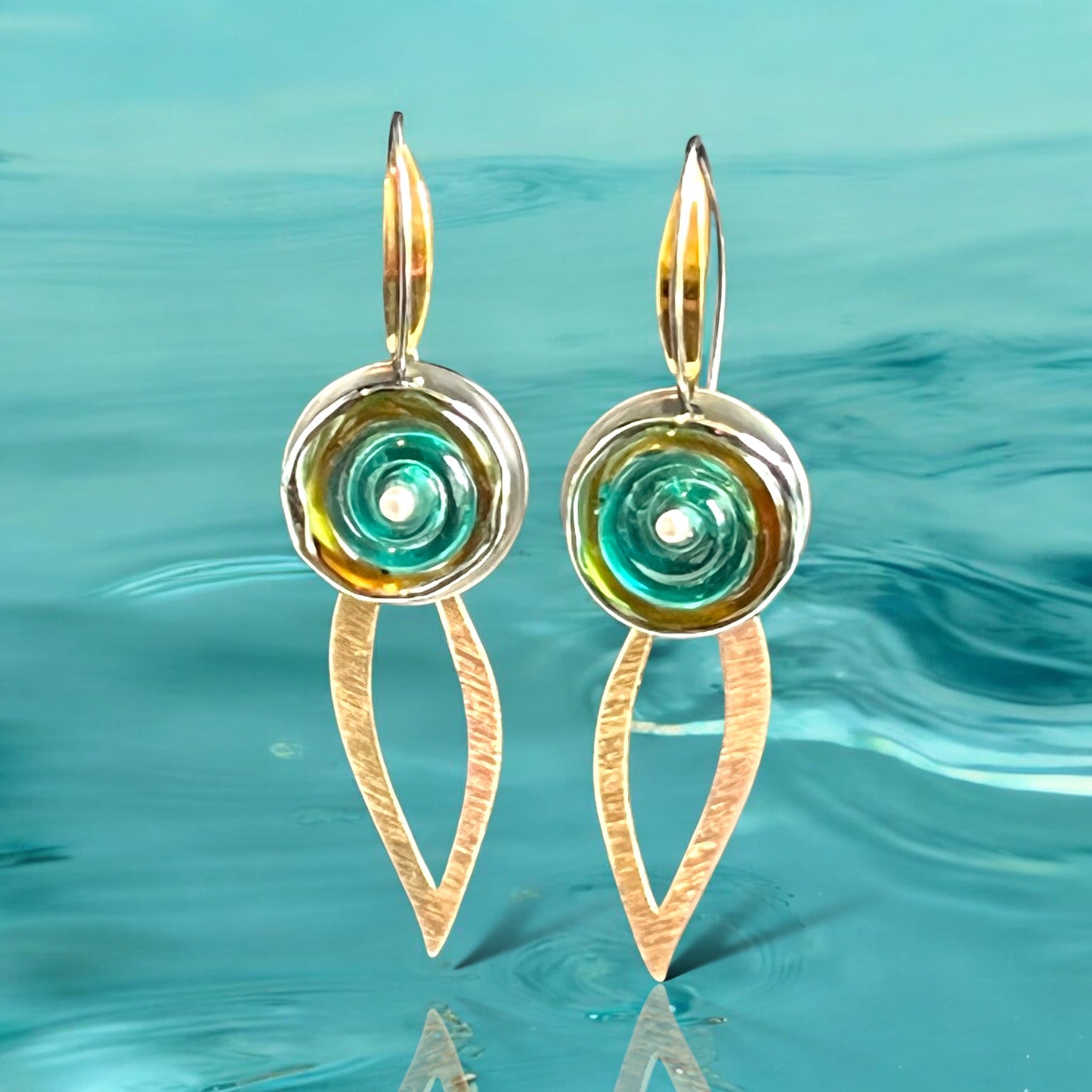 Lightweight and playful, these modern earrings feature open leaf shapes that dangle from colorful swirls of lamp work glass. The translucent shades of amber and a turquoise bluish green allow the silvery color of the domed disc to which it is riveted to sparkle through. Gold finish is protected with a coating and has a lovely brushed textural finish. Two-tone ear wires in oxidized sterling silver.