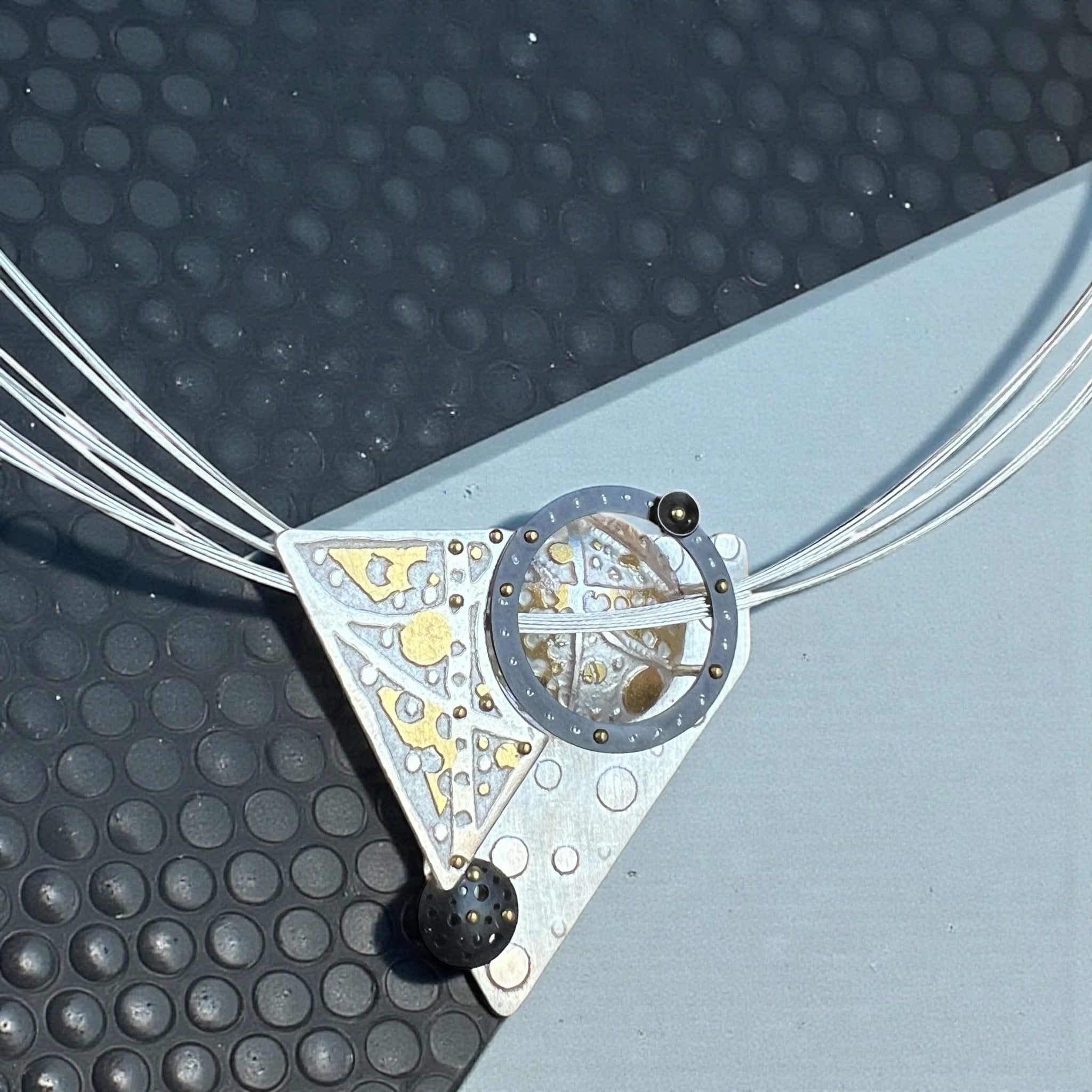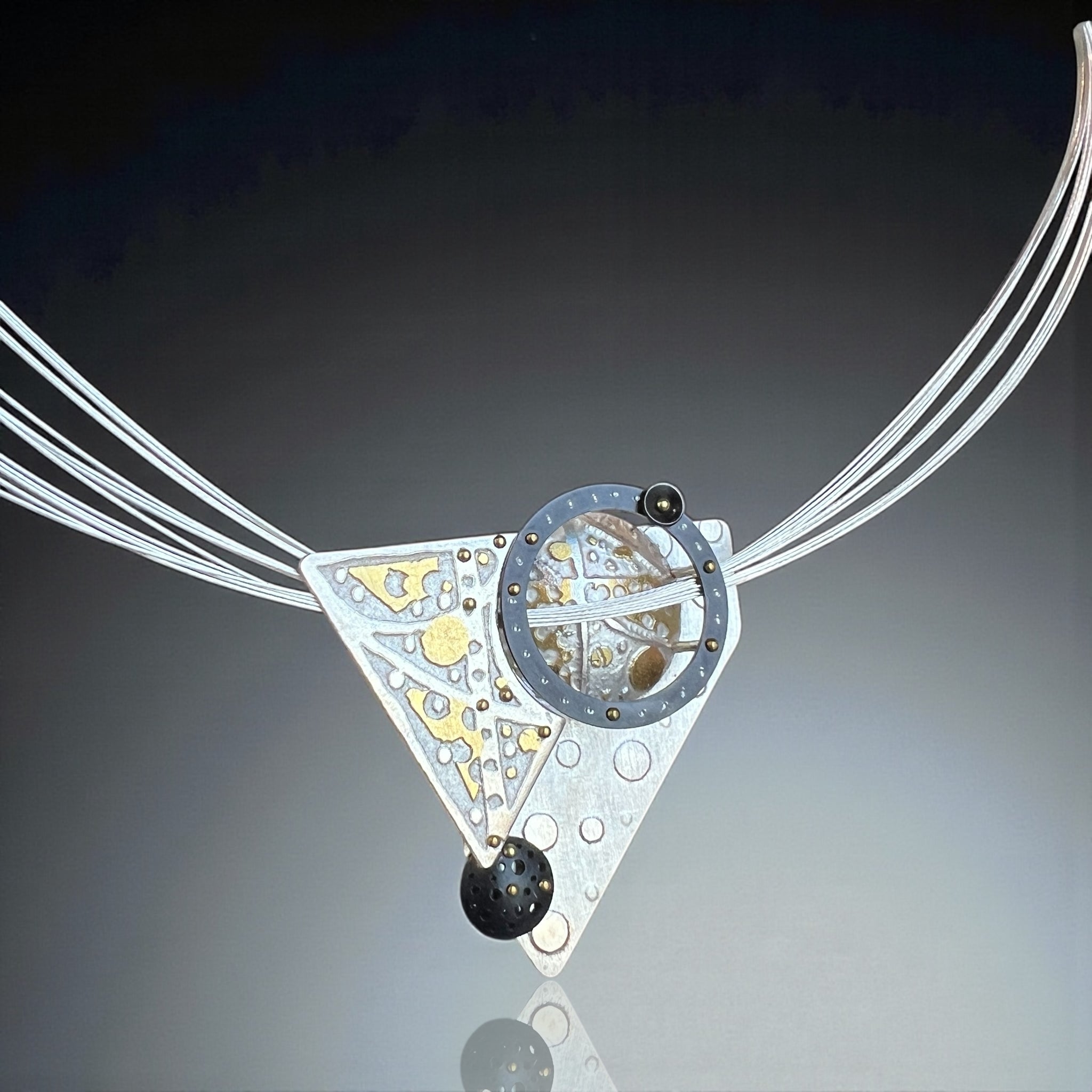 A bold one-of-a-kind pendant handcrafted in fine silver with 24K gold accents, oxidized black steel, and layered geometric forms. Intricate textures, pierced details, and kinetic overlaps give this piece a sculptural, contemporary feel. Designed and handmade by jewelry artist Diana Hirschhorn in Frederick, Maryland.