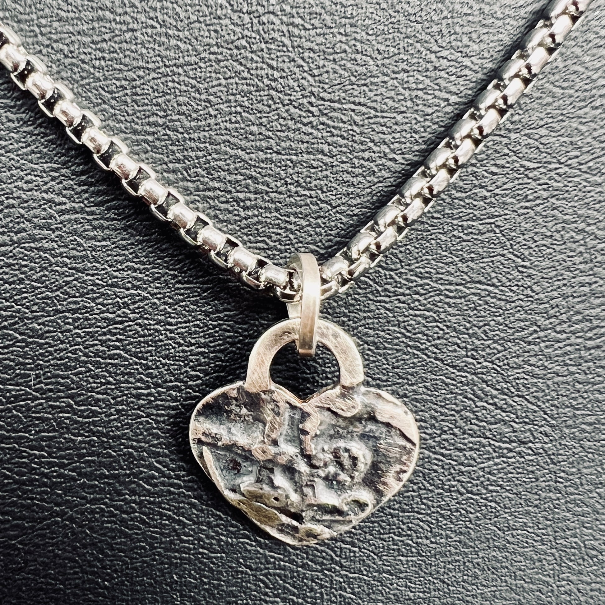 Etching lends a unique and edgy texture to this small gently domed heart shaped sterling silver charm necklace. Oxidized, it brings the lovely organic texture to life...and will never need to be polished! This heart charm pendant has a bail on top with a stainless steel box chain in 18" length. Complete with a 2" extender, it can be worn at 18" or 20". Small, sweet and lovely!